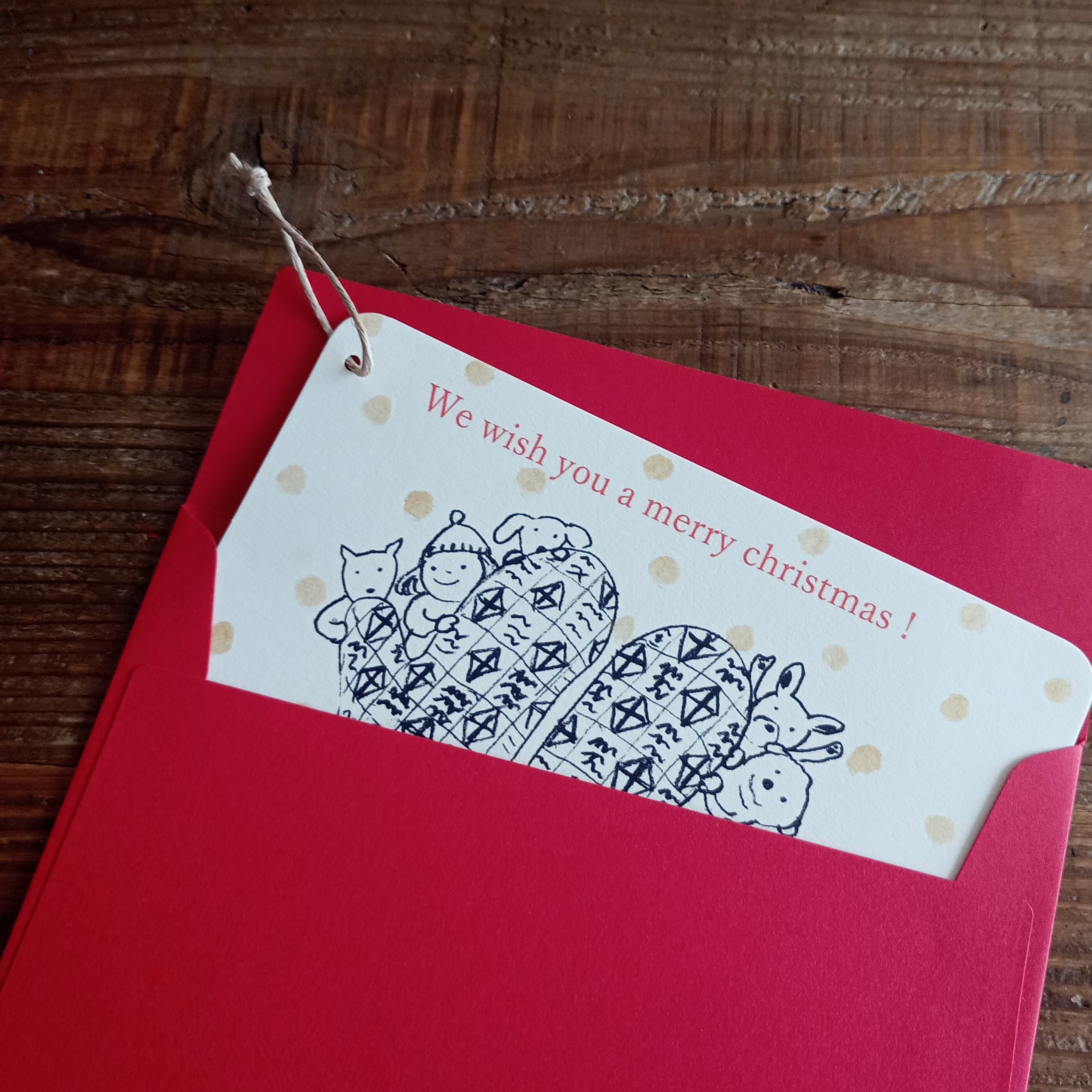 白黒の線で描いた小さな女の子と動物たちの世界。金色の模様はひとつひとつ手描きで仕上げました。赤い封筒が冬の贈り物にぴったりのアクセントです。